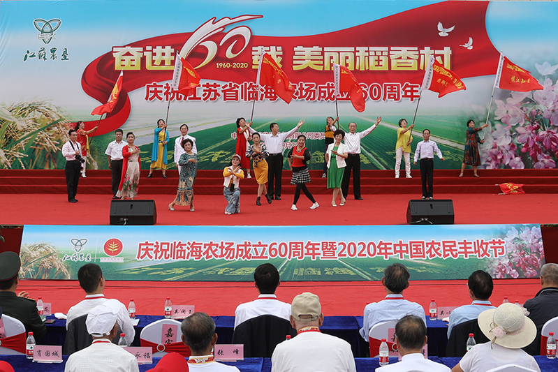 慶祝大會圓滿結束后,參加活動的領導、來賓與職工群眾一同觀看了場慶文藝演出。職工表演的鼓樂《歡慶》、舞蹈《幸福中國一起走》《我們都是追夢人》、古箏演奏《南泥灣》《在希望的田野上》、縣淮劇團的淮歌《愛不夠的地方是農場》抒發了人們熱愛農場、建設農場的豪壯志情。鎮江知青的情景劇《臨海大地在呼喚》、鳳陽花鼓《春風吹綠花鼓鄉》、無錫知青的詩朗誦《臨海農場,我的第二故鄉》,讓人們仿佛回到了崢嶸歲月,重溫60年艱辛光榮的奮斗史。情景朗誦《禮贊六十年》、歌伴舞《走向新輝煌》表達了臨海人的美好愿景,將文藝演出推向了高潮。