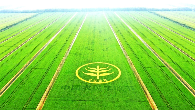 臨海農場公司黨委領導創新策劃,農業中心的青年員工精心設計,潛心打造,匠心作業,采用紫、黃、綠3種不同顏色的水稻,在農田里勾勒出“中國農民豐收節”文字圖案和LOGO,豐收美景躍然“稻”上,希望的田野鋪展最美畫卷, 豐收里滿載著喜悅和幸福。