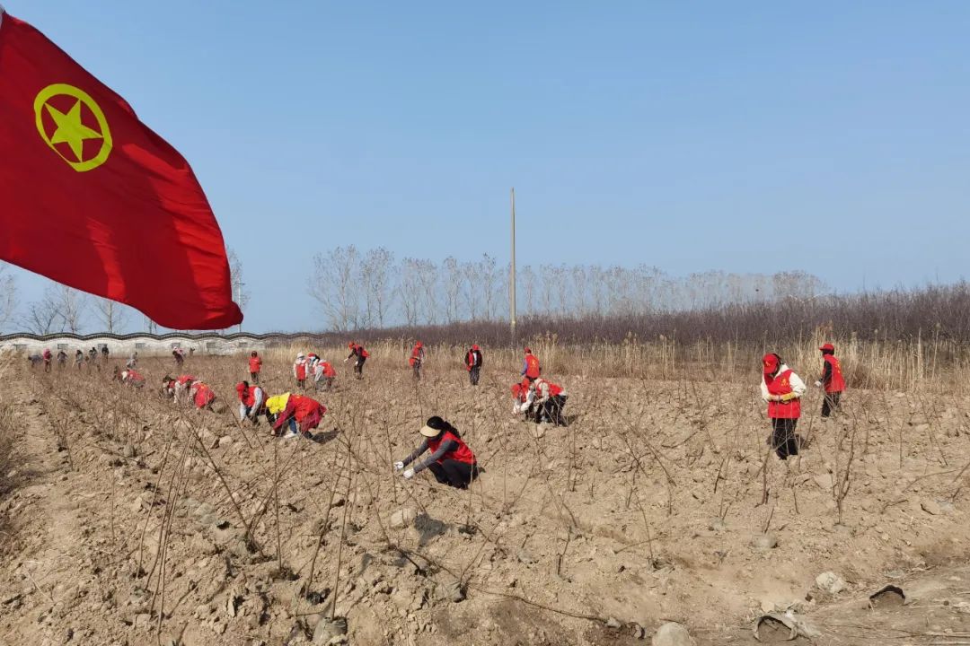 在植樹現場,黨委委員、副總經理、工會主席楊海燕與團員青年一并勞動。志愿紅點綴在春光和綠葉間,大家干勁十足,分工協作、揮鍬鏟土、扶苗圍堰、培實新土、澆水潤苗,呈現出一派熱火朝天的勞動場景。經過志愿者共同努力,共栽植4000余株中山杉小苗,造林10余畝。