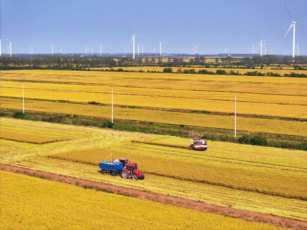 一簇簇飽滿的稻穗鋪滿了稻田,收割機與運糧車在田間相互協作,來回穿梭在田地中作業,收割、脫粒、吐稈一氣呵成,機器轟鳴,奏響著“三秋”生產的優美樂章。