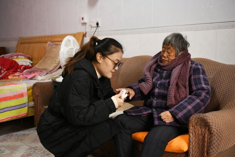 “爺爺,您今天身體感覺怎么樣?這是血氧儀,我們用它測量您的血氧狀態,測量指標在95-100之間都是正常的,如果平時身體有不舒服的癥狀,就趕緊給我打電話或者聯系咱們小區的網格員。”節日期間,鎮北居委會副主任葛芳坊奔走在各家各戶,為高齡獨居老人測量血氧,幫助老人們了解自身健康狀況,同時暖心叮囑老人們注意保暖,保持健康飲食,這種叮囑也成了她的工作日常。老年群體容易出現“沉默性缺氧”現象,而這些獨居老人大多沒有專業的檢測設備,又缺乏對自身健康的重視,一旦治療不及時將對身體造成損害。“我們通過定期上門為老人們檢測血氧,能夠幫助及時發現問題,盡量避免延遲治療帶來的風險。”