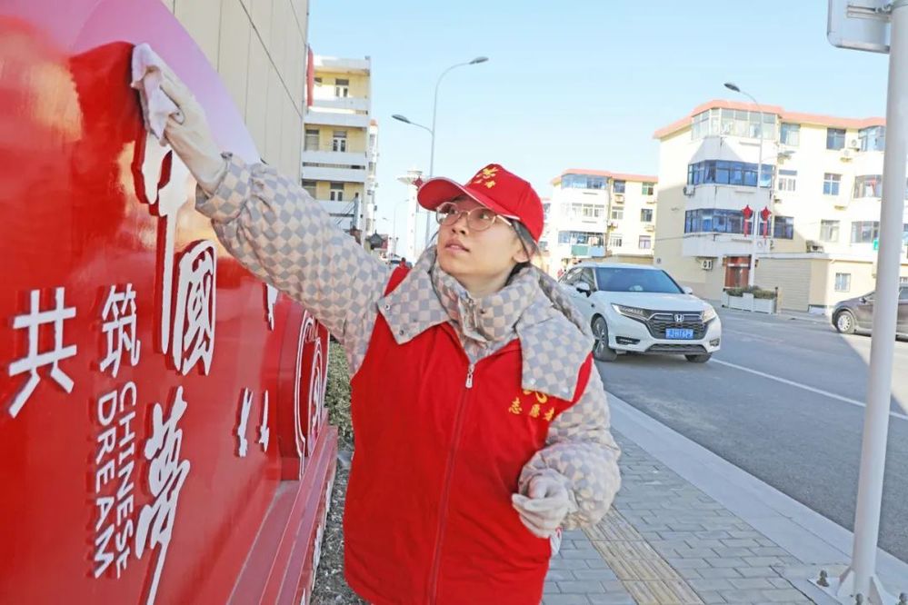 志愿者們身穿紅馬甲,手持清潔工具,從海城路最北端兵分兩路,依次排列在道路兩邊,他們相互配合,自北向南有序推進,對沿路的花箱、果皮桶、宣傳欄等公共設施進行洗刷清潔。一組花箱由2人負責,其中一人拎水桶到灑水車旁接水,另一人用抹布擦拭花箱上的積灰塵土,從花箱的外殼到內壁,每一個縫隙都仔細清理。宣傳欄旁6人圍成一組進行全面打掃,一些鳥類的糞便和沉積的污漬難以擦凈,志愿者們不時地淘洗抹布,反復來回擦拭,直到打掃干干凈凈為止。雖然雙手長時間浸泡在寒冷的水里凍得通紅,大家忍不住把手放到嘴邊哈氣取暖……經過一個多小時的辛勤勞作,海城路南北近2千米道路兩旁的公共設施煥然一新,路旁漢白玉似的花箱也像是穿上了新衣……路過的行人看到志愿者們專注的辛勤勞動,紛紛點贊表揚。