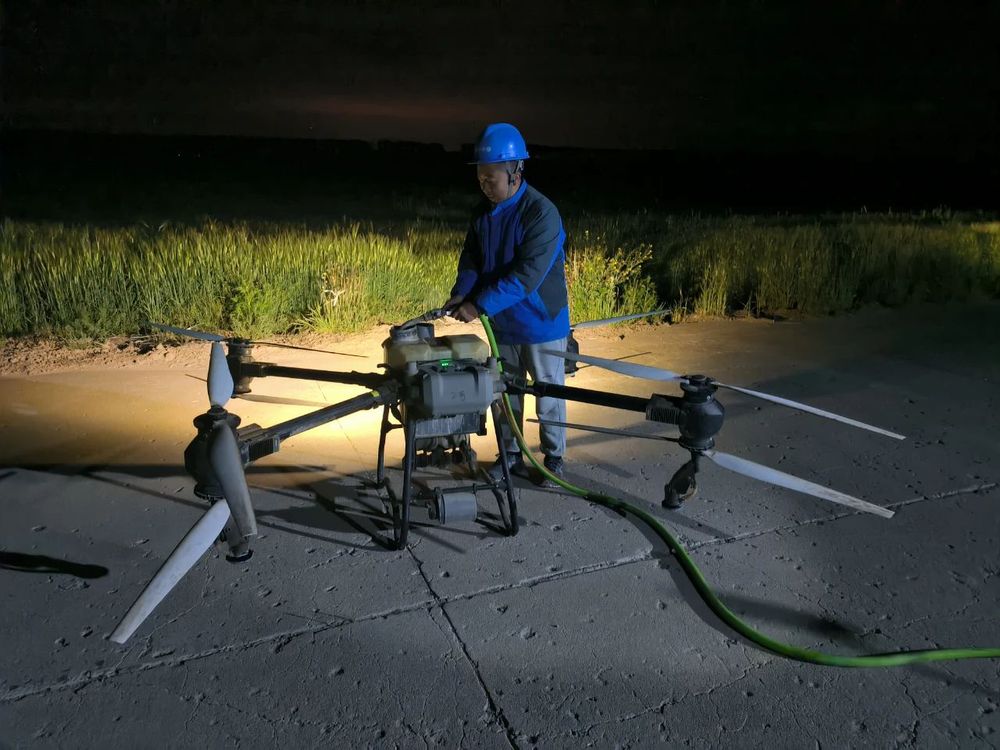 “五一”期間正值小麥抽穗揚花,是赤霉病防控的關鍵時期,為保障小麥安全生產,助力夏糧豐產豐收,臨海4萬余畝小麥全面開展赤霉病防治工作。分公司領導在崗帶頭組織農技人員深入田間地頭,指導科學防控,抓住適期、用準藥劑、用足水量、嚴抓質量,確保“一噴三防”效果。已是深夜23點,在14大隊兩架無人機打破了夜空的寧靜,燈光閃爍,不停地在田間穿梭,均勻的將藥液噴灑在小麥穗子上,管理人員王洋來自山西,研究生畢業后主動到基層大隊一線工作鍛煉。“今年五一不回老家了,農業生產不等人,我們選擇在夜間飛防打藥,夜間風小、蒸發量小,比白天防治效果更好,雖然辛苦點但很值得,能和大家在一起奮斗保障小麥安全很是高興”王洋欣喜的說道。