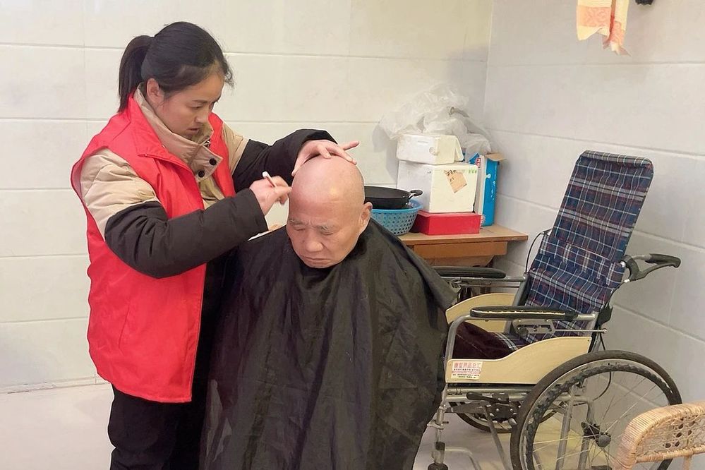 為場域內年紀大、行動不便的老人義務理發是志愿者戴彩云一直堅持在做的事情,至今已有5個年頭。一推一剪之間,傳遞的是愛心與溫暖。在空巢老人呂奶奶家中,戴彩云一邊與老人聊著家常,一邊根據老人的需求修剪出合適的發型。盡管條件有限,但戴彩云手法熟練,不一會就剪出了一個精神利落的發型。呂奶奶照了照鏡子,露出了滿意的笑容,“多虧了小戴每個月都來,這頭發長了不舒服,一剪完,我整個人都精神了不少。”