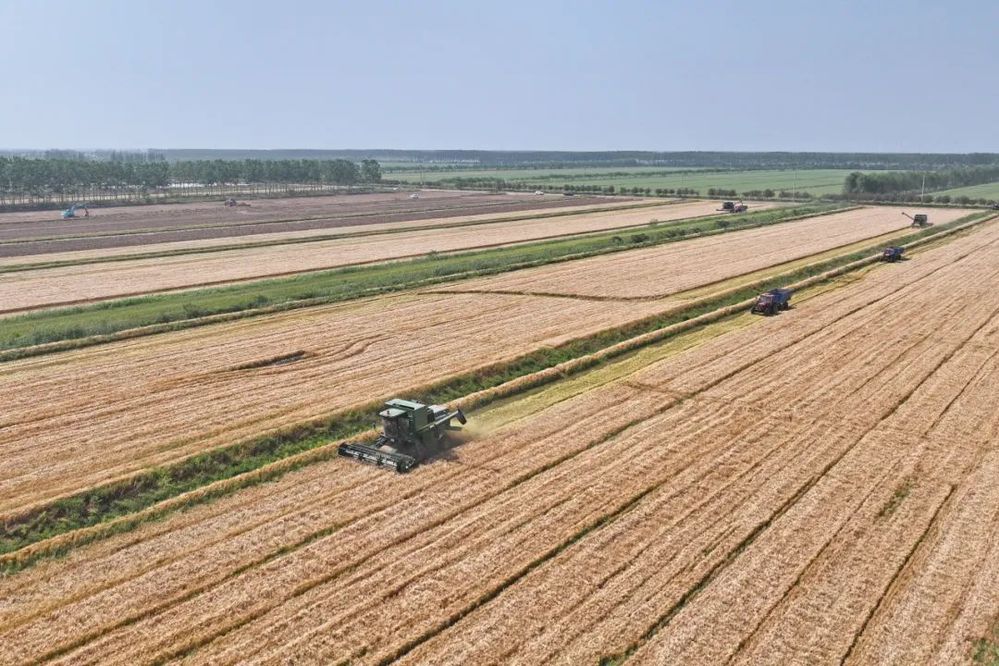 伴隨著隆隆的轟鳴聲,45臺大型收割機正開足馬力,穿梭于各大隊麥田,一簇簇麥穗被卷入機倉,切割、剝殼、脫粒一氣呵成,一粒粒金黃的麥粒被收入“囊”中。微風拂過,帶來陣陣麥香,一派豐收的喜人景象。