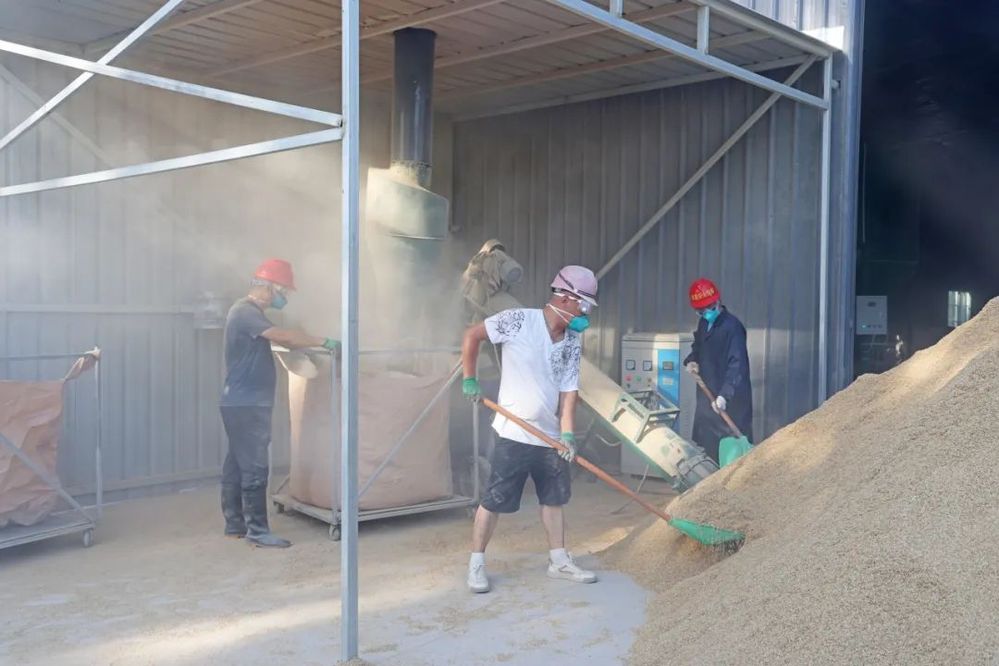 隨著工作戰(zhàn)線的拉長(zhǎng),汗水不斷從志愿者們額頭、下頜滑落,浸透了后背的衣衫。在嘈雜的機(jī)器轟鳴聲中,志愿者們分工協(xié)作,有序地將稻殼壘成堆,通過絞龍送進(jìn)粉碎機(jī)進(jìn)行粉碎。“稻殼粉碎后有助于種鵝采食量的增加,提高種鵝日增重,強(qiáng)壯種鵝體質(zhì),為后續(xù)產(chǎn)蛋提供保障。”工作人員季玉瑋介紹說。