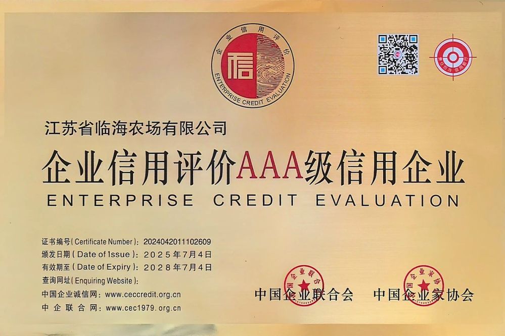 AAA級信用等級作為企業(yè)信用評定的最高榮譽,代表著企業(yè)在履約能力、社會聲譽、經營穩(wěn)定性等方面均達到行業(yè)標桿水平。江蘇省臨海農場有限公司始終將誠信經營作為企業(yè)發(fā)展的生命線,在生產經營中嚴格遵守法律法規(guī),堅持契約精神,以優(yōu)質的產品、可靠的服務贏得了客戶與市場的廣泛信任。此次獲評AAA級,不僅是對其過去誠信實踐的高度褒獎,更是對其未來持續(xù)擔當行業(yè)誠信表率的有力鞭策。